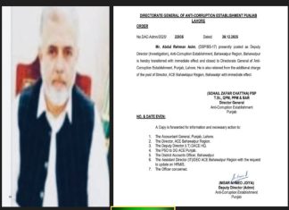 اینٹی کرپشن اسٹیبلشمنٹ بہاولپور ریجن میں تعینات عبدالرحمان عاصم کا فوری طور پر تبادلہ کرتے ہوئے ڈائریکٹوریٹ جنرل اینٹی کرپشن اسٹیبلشمنٹ پنجاب، لاہور رپورٹ کرنے کی ہدایت جاری کر دی گئی ہے۔