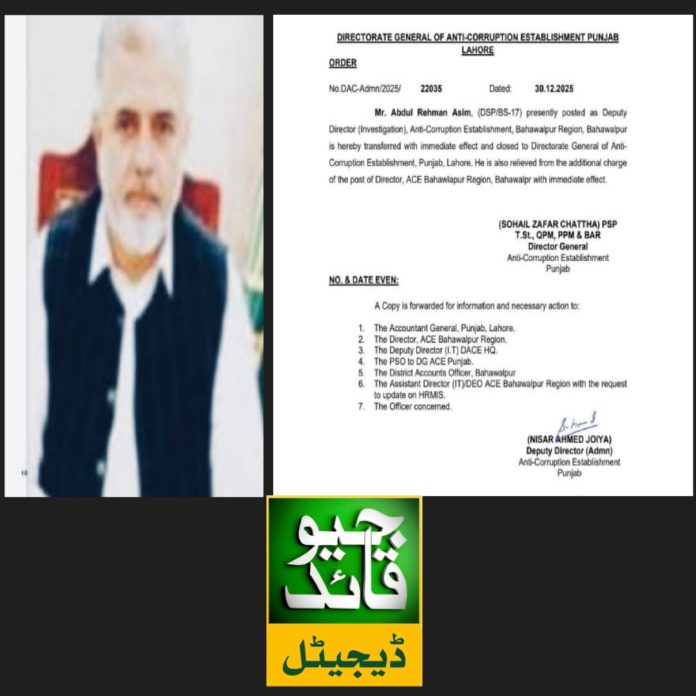 اینٹی کرپشن اسٹیبلشمنٹ بہاولپور ریجن میں تعینات عبدالرحمان عاصم کا فوری طور پر تبادلہ کرتے ہوئے ڈائریکٹوریٹ جنرل اینٹی کرپشن اسٹیبلشمنٹ پنجاب، لاہور رپورٹ کرنے کی ہدایت جاری کر دی گئی ہے۔